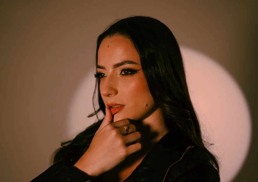 A woman poses in profile under a warm light that creates a circular halo behind her. She wears a black leather-style jacket and a dark top, while her long, wavy hair falls down her back. Her hand rests on her head, highlighting a confident and elegant attitude, with luminous makeup that highlights her features. The scene conveys a modern, sophisticated and slightly dramatic air.o.